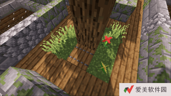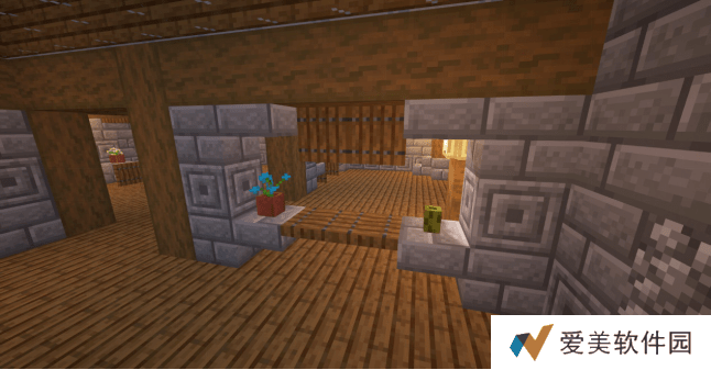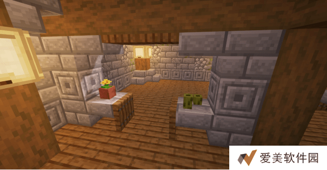 我们分别使用石砖、石砖台阶、錾制石砖,云杉木活板门、花盆、海泡菜搭建出图中的门框