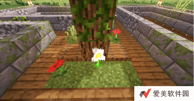 接下来我们将左边的橡树移植到屋顶的草方块上方,并在周围放一些草和花
