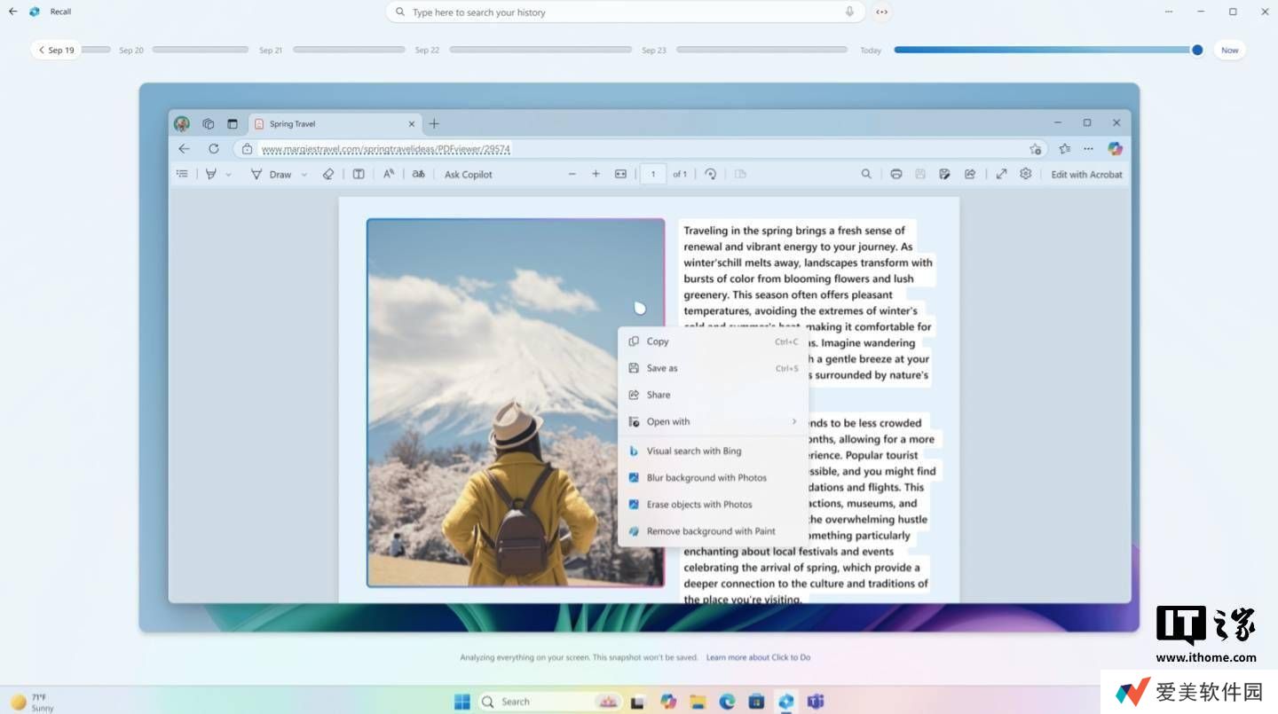 除了Recall功能外,新版本还包含了Click to Do预览版。这是一个AI工具,可以识别快照中的文本和图像,并提供多种AI操作。用户可以通过复制、打开方式、搜索Web、打开网站、发送电子邮件等操作来处理文本,也可以通过复制、另存为、分享、打开方式、使用Bing进行视觉搜索等操作来处理图像。