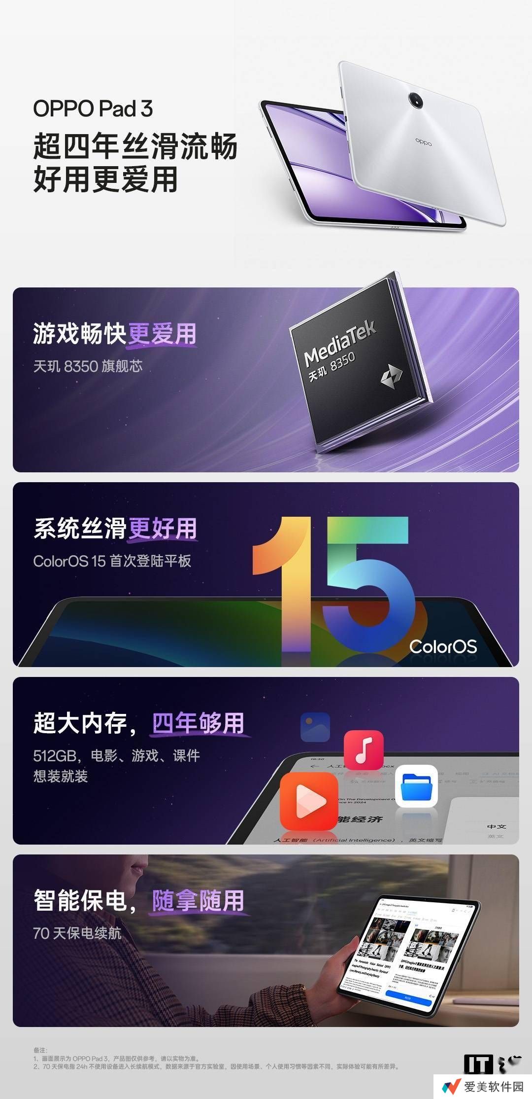 据悉,OPPO Pad 3搭载了联发科的天玑8350处理器,为用户带来强劲的性能体验。这款平板还预装了ColorOS 15系统,这是该系统首次应用于OPPO的平板产品中。