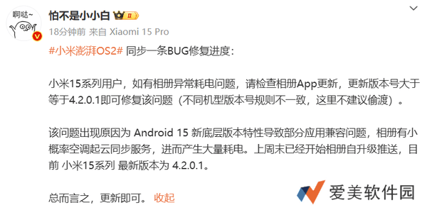 针对小米15系列用户反馈的相册异常耗电问题,小米官方也迅速作出回应。据透露,该问题主要由Android 15新底层版本特性引发的部分应用兼容问题所致。为解决这一问题,小米已经向用户推送了相册应用的更新,要求用户将相册App更新至4.2.0.1或更高版本以修复该耗电问题。