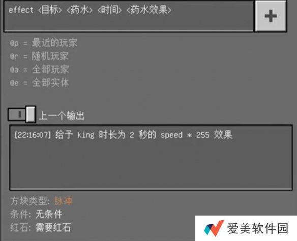 2、指令含义:@s 玩家自己 @a 所有玩家 @p 最近玩家 @r 随机玩家 @e 所有生物。