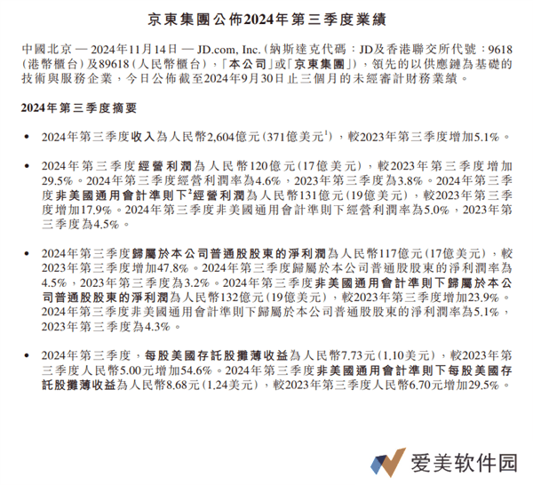 京东近日公布了2024年第三季度的财务报告,数据显示,该季度公司营收达到了2604亿元,相比去年同期增长了5.1%。同时,归属于普通股股东的净利润也实现了显著增长,达到117亿元,同比增长率高达47.8%。