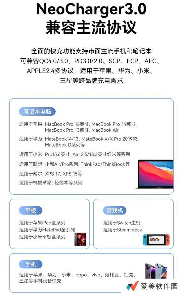 该款充电器套装不仅功能强大,更在兼容性上表现出色。它完美适配苹果全家桶,并搭载了自研的Neocharger3.0技术。这一技术能够智能识别连接的设备,并自动分配最佳的充电功率,确保每台设备都能获得高效且安全的充电体验。