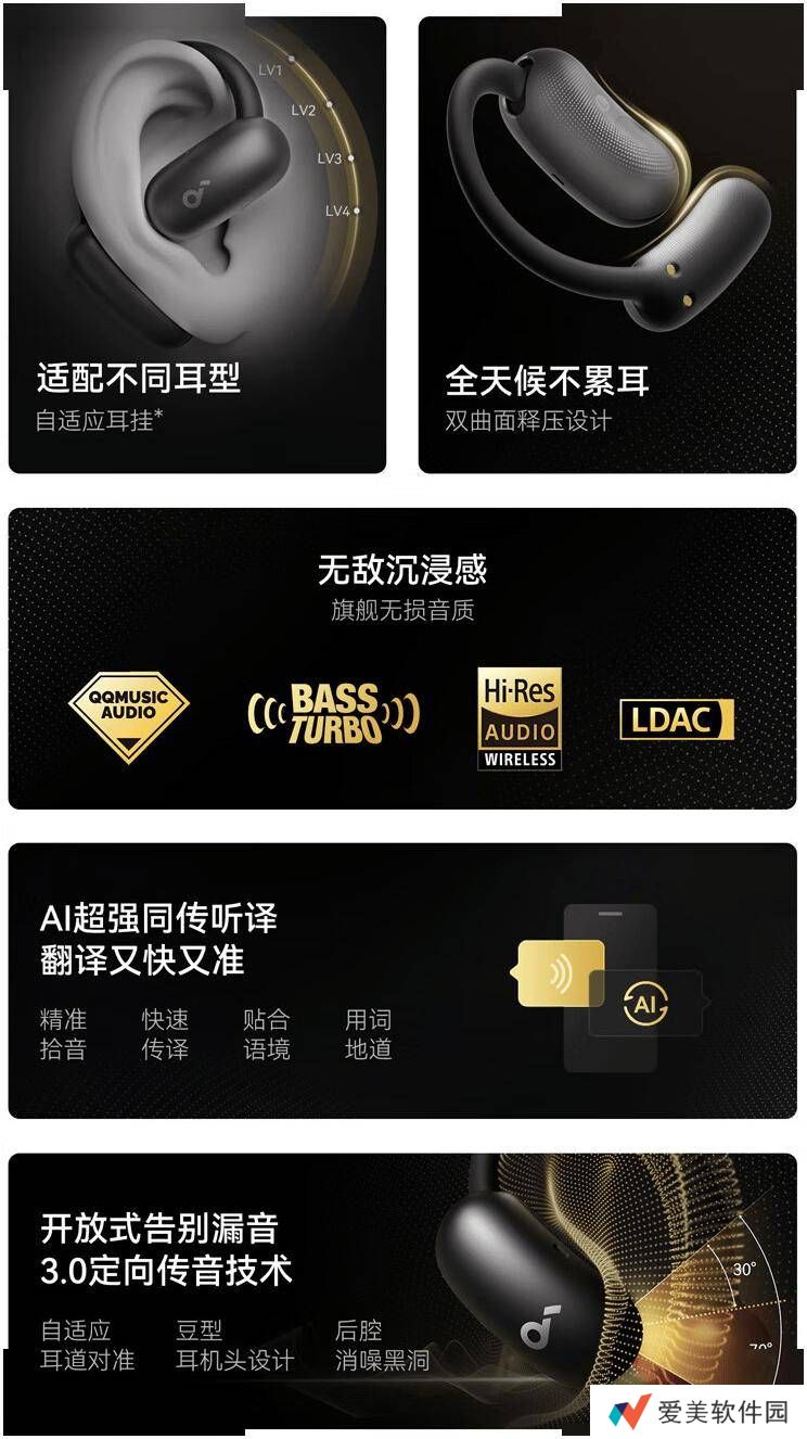 飞跃线Air开放式耳机提供黑白两种经典配色选择,其双曲面豆形设计与自适应耳挂的搭配,不仅时尚舒适,更支持4档调节,满足不同用户的佩戴需求。耳机采用的3.0定向传音技术,有效实现了“不漏音”的效果,保证了音质的纯净与私密性。