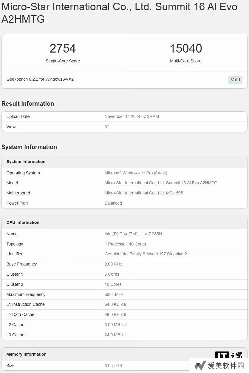 据 Geekbench 数据显示,Ultra 7 255H 处理器拥有 6 个性能核(P 核)、8 个能效核(E 核)以及 2 个低功耗能效核(LPE 核),最高频率可达 5.1 GHz。在单核测试中,该处理器获得了 2754 分的高分,多核测试则达到了 15040 分。
