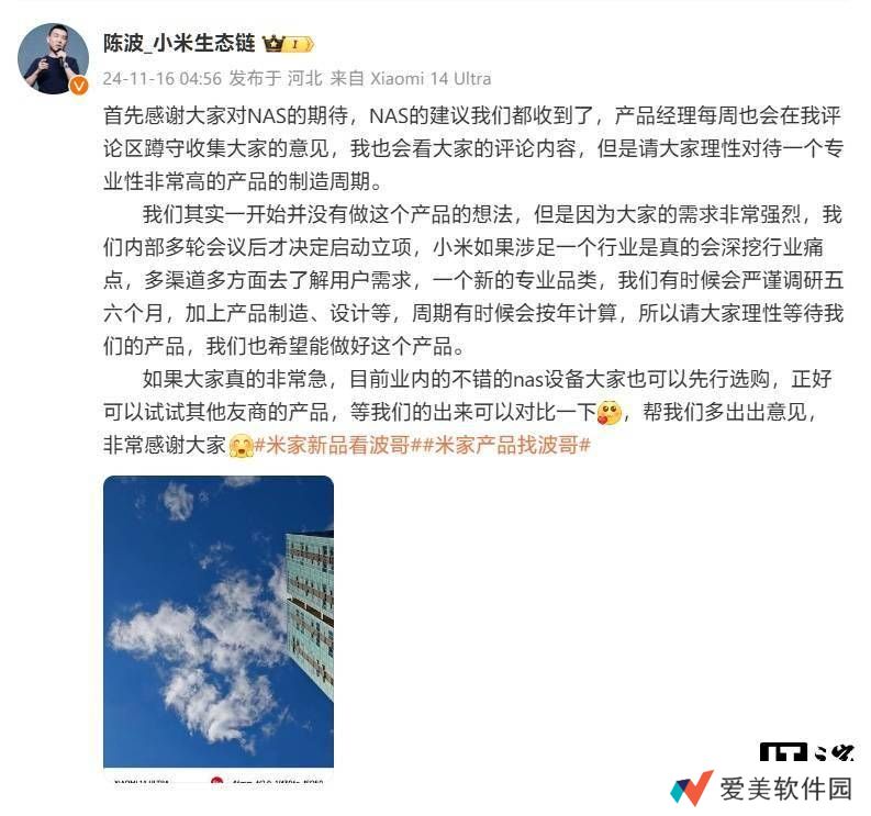 虽然陈波并未透露具体的上市时间,但他表示,希望大家能够保持期待,并给予团队足够的时间去打磨产品。对于急需NAS设备的用户,他也建议可以先尝试其他品牌的产品,等小米的NAS产品上市后,再进行对比和选择。